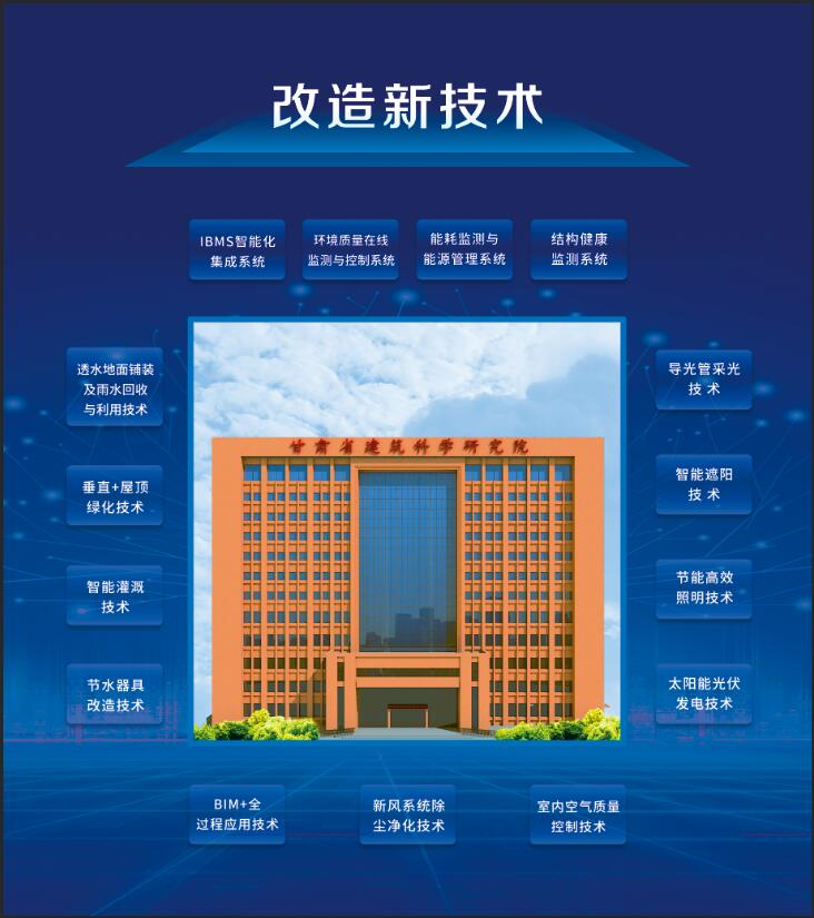 近幾年,建科院致力于綠色建筑研究,對既有建筑物的綠色智慧改造進行了深入探討。從“建研大廈”購置初期,就針對該項目組建了規(guī)劃、設(shè)計、科研團隊,對甘肅省綠色建筑適用技術(shù)進行了分析和篩選,全程跟進項目進展。建研大廈綠色智慧改造,具體分為圍護結(jié)構(gòu)節(jié)能改造技術(shù)、室內(nèi)外環(huán)境優(yōu)化技術(shù)、新能源利用與智能系統(tǒng)應(yīng)用技術(shù)四大方面,關(guān)鍵技術(shù)可以概況為建筑智能化管理平臺、環(huán)境監(jiān)測管理平臺、能耗監(jiān)測管理平臺、結(jié)構(gòu)健康監(jiān)測平臺的四大管理平臺系統(tǒng)與BIM+設(shè)計改造運維管理技術(shù)、多功能智慧展廳技術(shù)、新風系統(tǒng)除塵凈化及室內(nèi)空氣質(zhì)量控制技術(shù)、導(dǎo)光管采光技術(shù)、智能遮陽技術(shù)、屋頂綠化技術(shù)、雨水利用技術(shù)、智能灌溉技術(shù)等20余項建筑新技術(shù)。