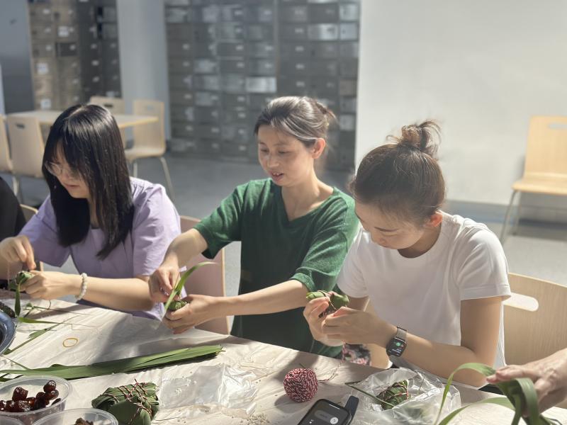 活動(dòng)現(xiàn)場(chǎng),顆粒飽滿的糯米、香甜的蜜棗、豆沙等原材料整齊地?cái)[放在桌子上,大家在工作人員的指導(dǎo)下,把粽葉卷成漏斗狀,填入餡料,壓實(shí)糯米,再用小繩一捆一繞,一個(gè)巴掌大小的粽子就成型了。大家邊包粽子邊交流經(jīng)驗(yàn),動(dòng)作從生疏到嫻熟,一片片粽葉在他們的手中翻飛、彎曲折疊,現(xiàn)場(chǎng)歡聲笑語不斷。