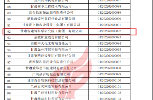 近日,高新技術(shù)企業(yè)認(rèn)定管理工作網(wǎng)發(fā)布公告,公布了甘肅省認(rèn)定機構(gòu)2022年認(rèn)定的第一批高新技術(shù)企業(yè)進(jìn)行備案名單。甘肅建科院榜上有名,順利通過高新技術(shù)企業(yè)復(fù)評。