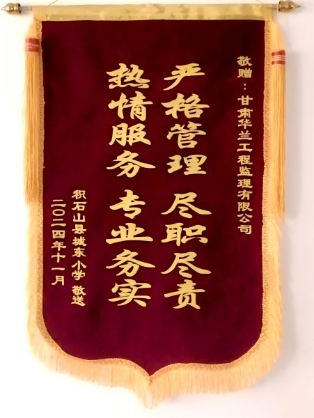 近日,甘肅建科院華蘭監(jiān)理公司積石山縣城東小學(xué)維修加固項(xiàng)目部收到了來自學(xué)校領(lǐng)導(dǎo)贈(zèng)送的一面繡著“嚴(yán)格監(jiān)理 盡職盡責(zé) 熱情服務(wù) 專業(yè)務(wù)實(shí)”的錦旗,錦旗上的十六個(gè)字不僅凝聚了校方的感激與贊許,更是對(duì)監(jiān)理公司以實(shí)際行動(dòng)踐行國(guó)企擔(dān)當(dāng)?shù)恼鎸?shí)寫照。