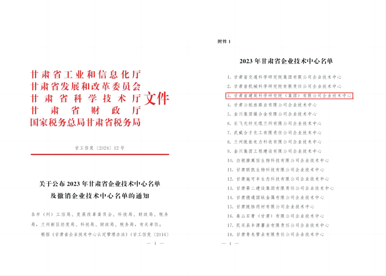 近日,從甘肅省工信廳獲悉,甘肅建科院成功獲批甘肅省企業(yè)技術(shù)中心。此次甘肅建科院獲批省級企業(yè)技術(shù)中心,是政府行業(yè)主管部門對公司創(chuàng)新能力及創(chuàng)新成果的肯定,代表著公司科技創(chuàng)新水平與科技創(chuàng)新實力處于省內(nèi)行業(yè)領(lǐng)先地位,標(biāo)志著公司品牌形象及綜合實力再上新臺階。