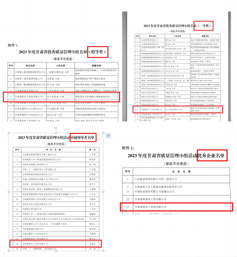 近日,2023年度“甘肅省質(zhì)量管理小組活動成果獎”揭曉,建投巖土科技公司被評為“2023年度甘肅省質(zhì)量管理小組活動優(yōu)秀企業(yè)”,2項QC活動成果取得優(yōu)異成績,其中《降低基坑支護(hù)混凝土噴射機(jī)損壞率》課題榮獲省級特等獎,《提高含水紅膠泥地層中旋噴樁一次性成樁合格率》課題榮獲省級一等獎?!皫r土科技QC小組”自成立來已連續(xù)三年榮獲QC活動成果省級特等獎、一等獎,兩位小組成員分獲“2023年度甘肅省質(zhì)量管理小組活動卓越領(lǐng)導(dǎo)者”和“2023年度甘肅省質(zhì)量管理小組活動優(yōu)秀推進(jìn)者”榮譽(yù)。