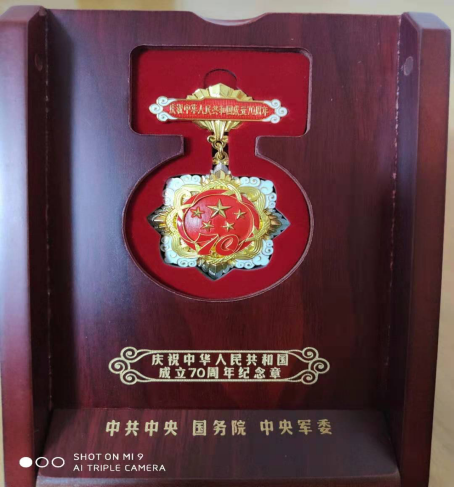 在新中國成立70周年之際,中共中央、國務(wù)院、中央軍委決定頒發(fā) “慶祝中華人民共和國成立70周年”紀(jì)念章。紀(jì)念章使用銅胎鍍金材質(zhì),主要元素為五星、“70”飄帶、團(tuán)錦結(jié)、如意祥云和光芒,主色調(diào)為紅色和金色。核心部分為五星,代表國家榮譽(yù)。“70”飄帶象征中華人民共和國70年奮斗歷程。團(tuán)錦結(jié)環(huán)繞在五星和“70”飄帶周圍,寓意全國各族人民大團(tuán)結(jié),構(gòu)建人類命運(yùn)共同體的愿景。章體外環(huán)以如意祥云、光芒構(gòu)成,象征人民對美好生活的向往,同時(shí)表達(dá)隆重慶祝中華人民共和國生日,禮贊國家富強(qiáng)、民族振興、人民幸福的輝煌成就,以及在70年輝煌奮斗成就的基礎(chǔ)上不忘初心、繼續(xù)前進(jìn)的堅(jiān)定決心。
