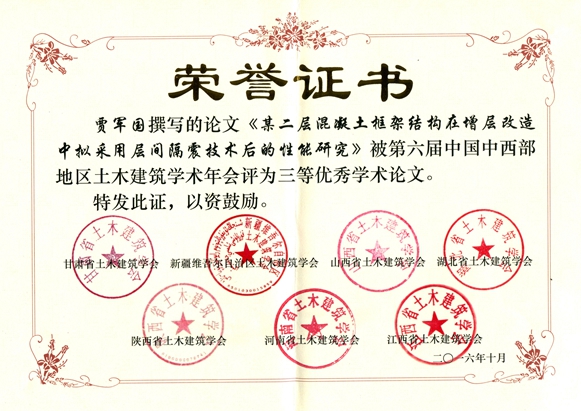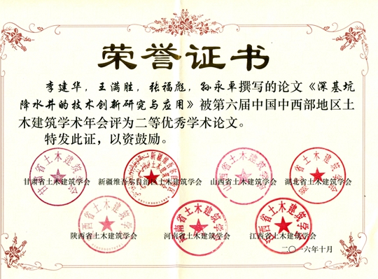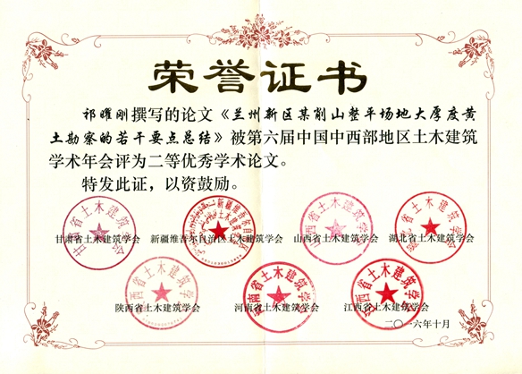 會議分三部分進行:首先是秘書長聯(lián)席會,通報第六屆會議準備情況,并探討中西部學會的發(fā)展情況;其次是開幕式及學術交流,共有王秀麗等9位教授或高級工程師做主題交流;最后頒發(fā)了西部土木工程防災減災青年人才工程獎、中國中西部地區(qū)土木建筑杰出工程師獎、優(yōu)秀論文獎三類獎項。在頒獎儀式上,我院四篇論文分獲第六屆中國中西部地區(qū)土木建筑學術年會二、三等獎。其中二等獎3項,分別是:王公勝、孫文同志撰寫的《黃土地區(qū)含淤泥卵石持力層既有樁后注漿技術及作用機理研究》;李建華、王滿勝、張福彪、孫永卓同志撰寫的《深基坑降水井的技術創(chuàng)新研究與應用》;祁曜剛同志撰寫的《蘭州新區(qū)某削山整平場地大厚度黃土勘察的若干要點總結》;三等獎1項,即賈軍國同志撰寫的《某二層混凝土框架結構在增層改造中擬采用層間隔震技術后的性能研究》。