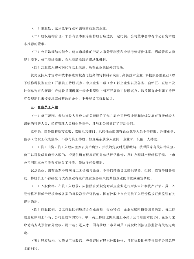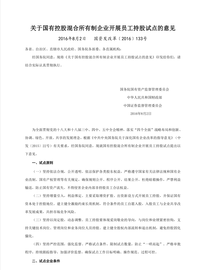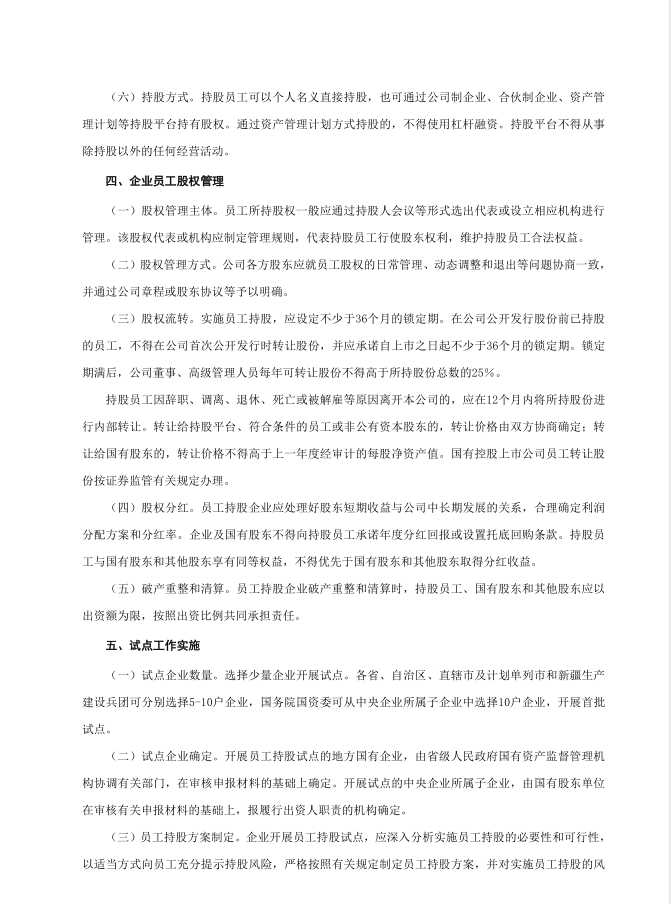 關(guān)于國(guó)有控股混合所有制企業(yè)開展員工持股試點(diǎn)的意見