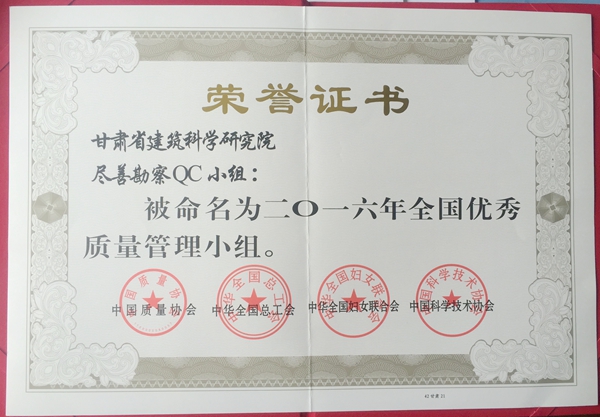 全國第三十八次質(zhì)量管理小組代表會議于2016年9月20日在浙江省嘉興市召開。會上,由甘肅省建筑科學(xué)研究院勘察分院盡善勘察小組申報的《提高重型動力觸探試驗(yàn)準(zhǔn)確率》成果,被甘肅省質(zhì)量協(xié)會推薦為全國優(yōu)秀QC小組成果,并被中國質(zhì)量協(xié)會、中華全國總工會、中華全國婦女聯(lián)合會和中國科學(xué)技術(shù)協(xié)會聯(lián)合授予“二〇一六年全國優(yōu)秀質(zhì)量管理小組”。