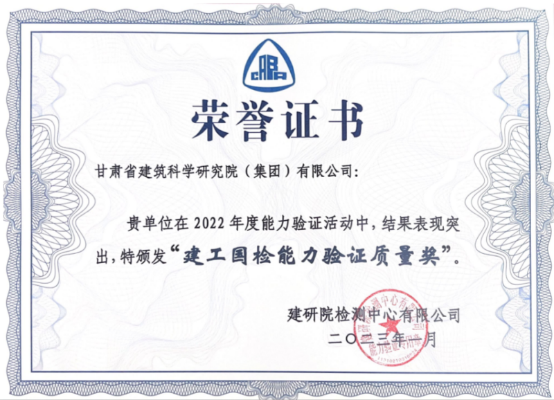 近日,甘肅建科院榮獲由中國(guó)建筑科學(xué)研究院建筑工程檢測(cè)中心頒發(fā)的“建工國(guó)檢能力驗(yàn)證質(zhì)量獎(jiǎng)”。