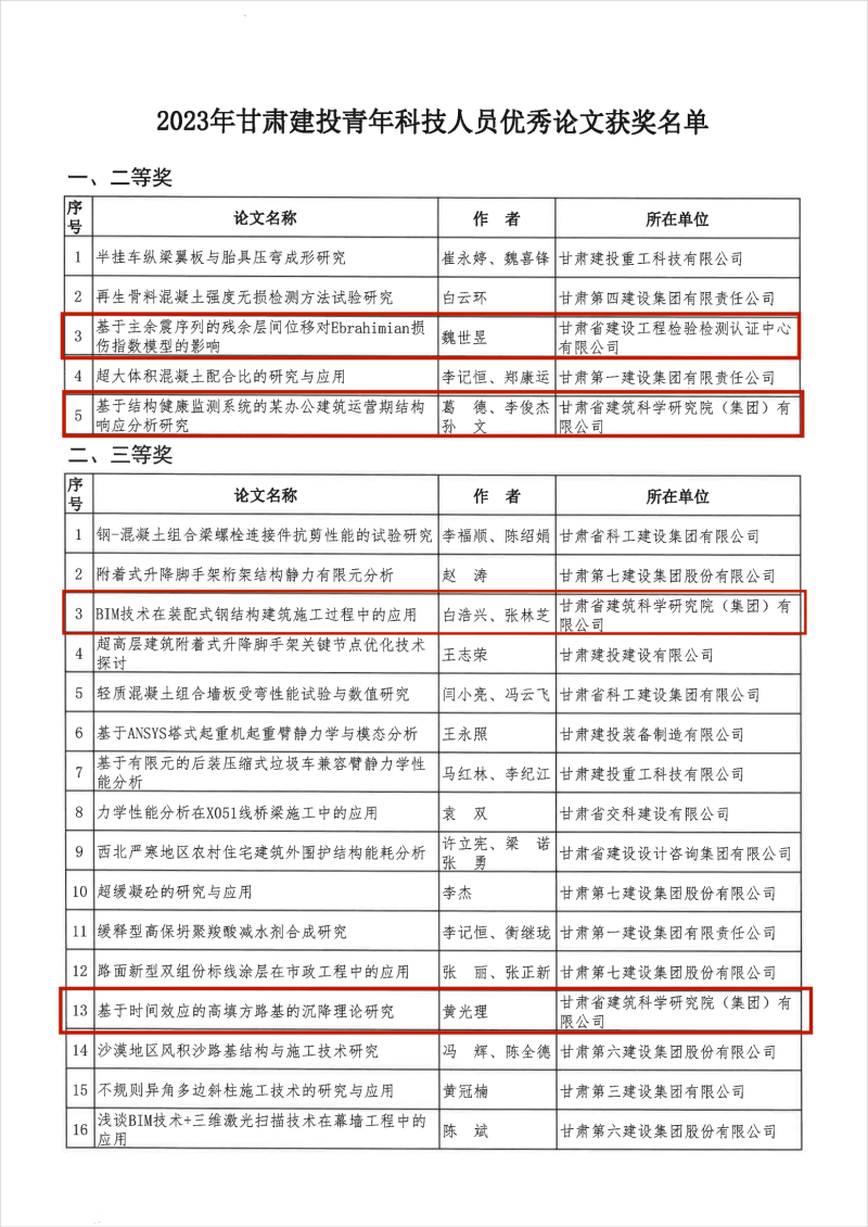 2023年甘肅建投青年科技人員優(yōu)秀論文評(píng)審公示已結(jié)束。甘肅建科院共4篇論文獲獎(jiǎng),其中二等獎(jiǎng)2篇,三等獎(jiǎng)2篇。