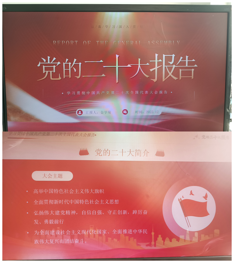 金學(xué)菊從深刻理解把握過(guò)去五年工作和新時(shí)代十年偉大變革的重大意義、習(xí)近平新時(shí)代中國(guó)特色社會(huì)主義思想的世界觀和方法論、以中國(guó)式現(xiàn)代化全面推進(jìn)中華民族偉大復(fù)興的使命任務(wù)、以偉大自我革命引領(lǐng)偉大社會(huì)革命的重要要求、團(tuán)結(jié)奮斗的時(shí)代要求等方面,對(duì)二十大精神作了系統(tǒng)宣講,讓大家進(jìn)一步深刻認(rèn)識(shí)到二十大精神對(duì)我們所處的這個(gè)時(shí)代和國(guó)家的重要意義。隨后黨員代表結(jié)合工作實(shí)際作了主題發(fā)言。他們表示,在今后的學(xué)習(xí)、工作中要切實(shí)把二十大精神轉(zhuǎn)化為強(qiáng)大的精神動(dòng)力,不斷武裝頭腦、指導(dǎo)實(shí)踐、推動(dòng)工作。