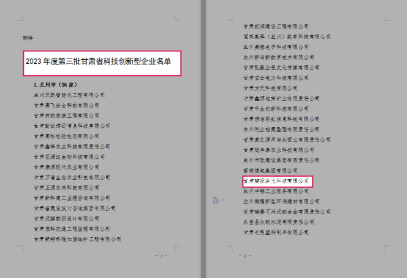 近日,從甘肅省科技廳下發(fā)的《關(guān)于認(rèn)定2023年度第三批甘肅省科技創(chuàng)新型企業(yè)的通知》(甘科高[2023]12號(hào))文件獲悉,甘肅建投巖土科技有限公司憑借突出的創(chuàng)新發(fā)明、工法、專利等科技成果,榮獲“2023年度甘肅省科技創(chuàng)新型企業(yè)”稱號(hào)。