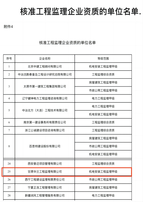 2023年新年伊始,甘肅建科院全資子公司華蘭工程監(jiān)理有限公司近日成功取得住房和城鄉(xiāng)建設(shè)部頒發(fā)的機(jī)電安裝工程監(jiān)理甲級(jí)資質(zhì)。