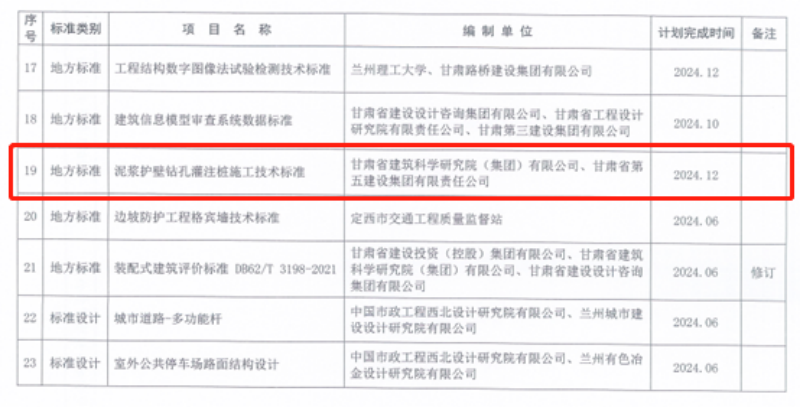 近日,甘肅省住房和城鄉(xiāng)建設(shè)廳下達(dá)了《2023年甘肅省工程建設(shè)標(biāo)準(zhǔn)及標(biāo)準(zhǔn)設(shè)計(jì)編制項(xiàng)目計(jì)劃》(第一批)通知,由科技研發(fā)中心負(fù)責(zé)申報(bào)的《泥漿護(hù)壁鉆孔灌注樁施工技術(shù)標(biāo)準(zhǔn)》正式立項(xiàng)。該標(biāo)準(zhǔn)由甘肅建科院聯(lián)合甘肅省第五建設(shè)集團(tuán)有限責(zé)任公司共同主編,是2023年第一批甘肅省工程建設(shè)標(biāo)準(zhǔn)及標(biāo)準(zhǔn)設(shè)計(jì)編制項(xiàng)目計(jì)劃中唯一由我公司主編的地方標(biāo)準(zhǔn)。