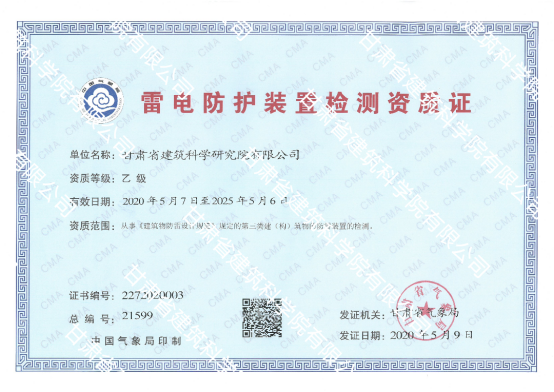 近日,經(jīng)甘肅省氣象局審查,甘肅省建筑科學(xué)研究院有限公司喜獲甘肅省氣象局頒發(fā)的《雷電防護(hù)裝置檢測資質(zhì)證書(乙級(jí))》。