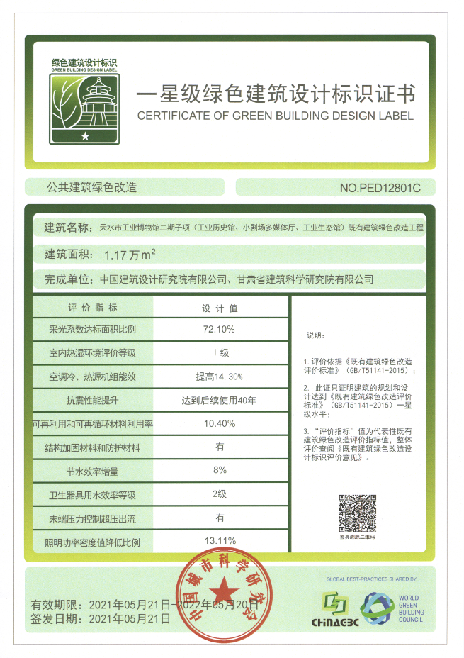 10月,中國城市科學(xué)研究會通過線上的方式召開全國第七批綠色建筑標(biāo)識評審會,由建科院(集團(tuán))公司綠建中心進(jìn)行既有建筑綠色改造設(shè)計(jì)(一星)評價(jià)咨詢的天水市工業(yè)博物館二期子項(xiàng)順利通過了綠建評審。2020年8月,中國建筑設(shè)計(jì)研究院有限公司委托建科院(集團(tuán))公司對該項(xiàng)目進(jìn)行既有建筑綠色改造設(shè)計(jì)(一星)評價(jià)咨詢。建科院(集團(tuán))公司綠色建筑與產(chǎn)業(yè)研發(fā)中心為該項(xiàng)目的綠建改造和綠色建筑標(biāo)識申報(bào)提供了技術(shù)支撐。本項(xiàng)目是建科院(集團(tuán))公司綠建中心繼《蘭州市建研大廈綠色智慧改造項(xiàng)目》之后的又一個(gè)甘肅省既有建筑綠色改造項(xiàng)目評星工作,此項(xiàng)工作的順利完成在響應(yīng)國家政策號召的同時(shí)也體現(xiàn)了建科院(集團(tuán))公司在既有建筑物綠色改造方面的雄厚實(shí)力。