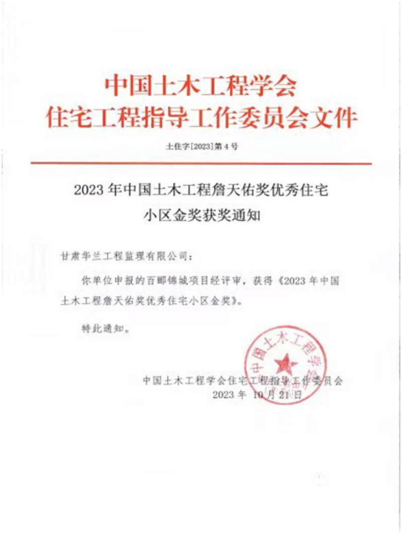 近日,從中國土木工程學(xué)會(huì)住宅工程指導(dǎo)委員會(huì)傳來喜訊,由甘肅華蘭工程監(jiān)理有限公司參與建設(shè)的成都百酈錦城項(xiàng)目榮獲“2023中國土木工程詹天佑獎(jiǎng)優(yōu)秀住宅小區(qū)金獎(jiǎng)”。