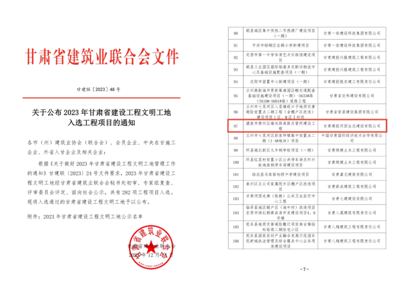 近日,從甘肅省建筑業(yè)聯(lián)合會傳來喜訊,由甘肅華蘭工程監(jiān)理有限公司參建的酒泉市肅州區(qū)雄關(guān)路道路及管網(wǎng)建設(shè)工程項目榮獲“2023年甘肅省建設(shè)工程文明工地”稱號。